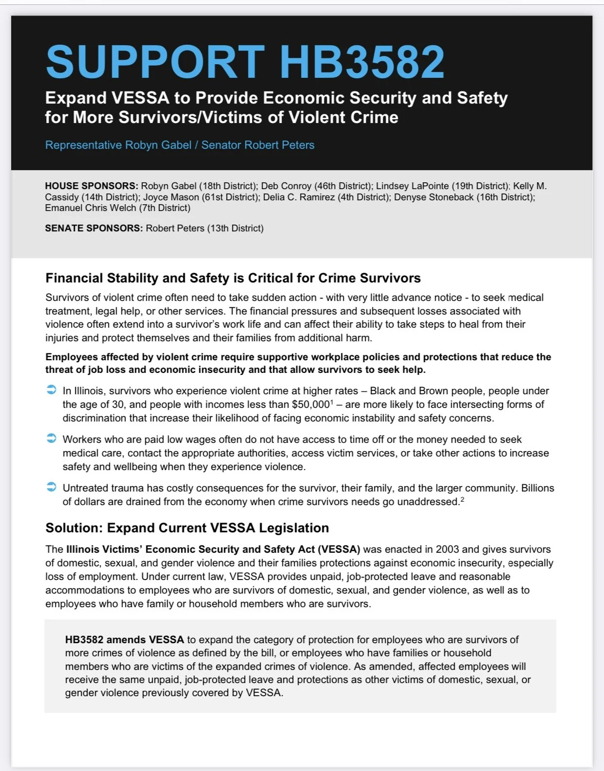 Provided expert testimony to the IL House and Senate committees on the importance of this amendment to create a Trauma-Informed societal response to ALL victims of violent crimes, who are often young and from lower socioeconomic backgrounds with less workplace protections, and their family members.